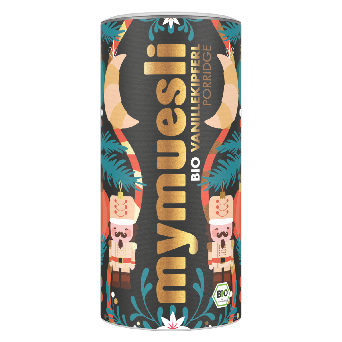 feine Haferflocken (81%), weiße Schokolade (9%) (Rohrohrzucker, Kakaobutter, Vollmilchpulver), Bratapfelkekse mit Gewürzmischung (4%) (Weizenmehl, Rohrohrzucker, Sonnenblumenöl, Weizenstärke, Apfelpulver, gehackte Weinbeeren, Zuckerrohrmelasse, Gewürzmischung (Vollrohrzucker, Kokosblütenzucker, Zimt, Tonkabohne, Vanille, Pfeffer, Orange, Zitrone, Nelke), Meersalz*, Backtriebmittel: Natriumhydrogencarbonat*, natürliches Bourbon-Vanillearoma, Karamellzuckersirup, Antioxidationsmittel: Rosmarinextrakt), Vanillezucker (3%) (Zucker, Vanillepulver), geröstete Mandeln.